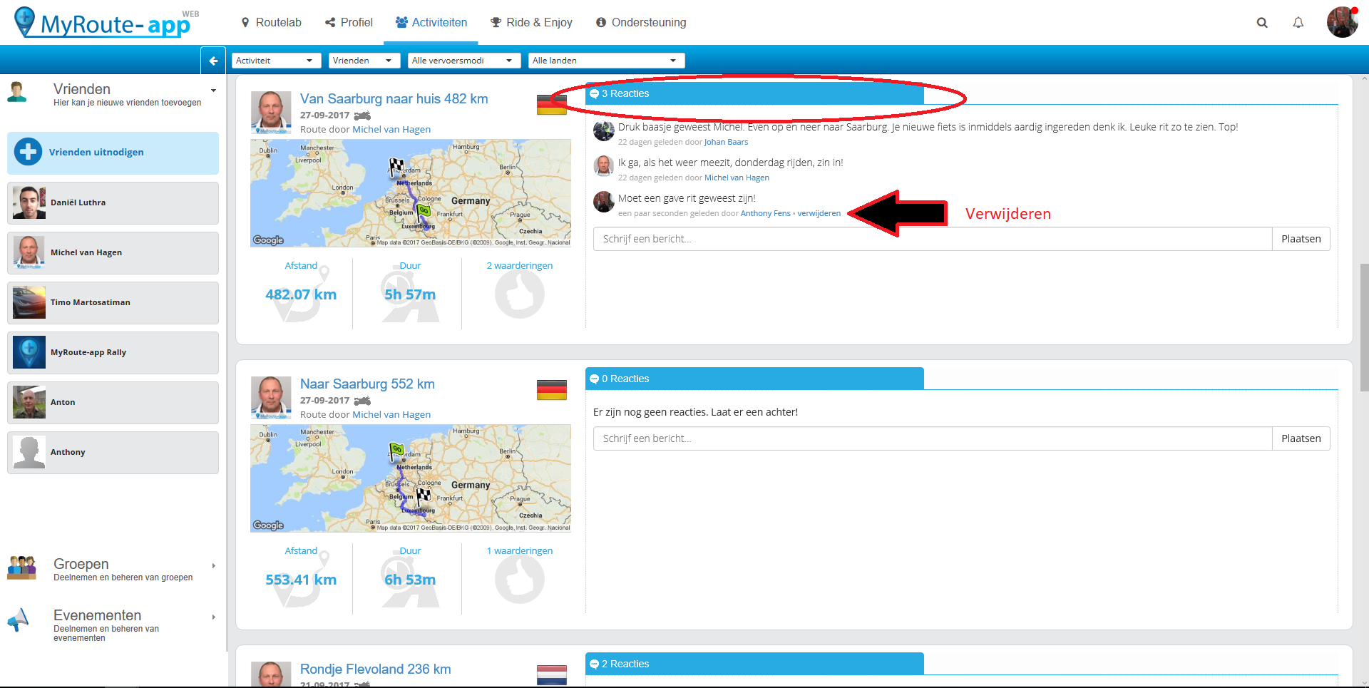 En cliquant sur la photo, vous l'agrandirez et afficherez le titre et la légende du moment. Vous pouvez ensuite utiliser les flèches situées à côté de la photo pour naviguer entre les différentes photos. Vous pouvez fermer l'affichage de la photo agrandie en cliquant à côté de la photo. - Commentaires - Ici vous pouvez voir les commentaires ajoutés par les utilisateurs. Si vous êtes connecté, vous pouvez également laisser un commentaire. Vous pouvez supprimer vos propres commentaires à tout moment. La personne qui a placé l'activité peut supprimer toutes les réactions sur son activité.